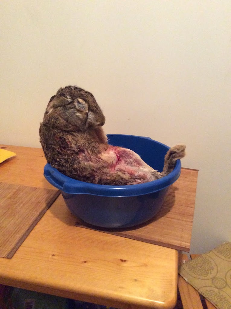 E pur si muove, in traducere libera -iepurele este mov. Am primit un iepure de la o colega ( aferim Carmencita inca o data). Vanat. Vanat adica impuscat nu mov. Problema e ca mi-a fost adus ca o rusoaica batrana iesita de pe piata. Recte cu cizme si neepilat. Am golit congelatorul de peste si am indesat alergatorul. O saptamana mai tarziu l-am scos si l-am lasat sa se dezghete. In ligheanul de rufe. Treaba nasoala e ca tocmai pusesem rufe la spalat. Cu ce duc rufele in balcon? Cu manutele astea doua, am facut drumuri vreo noua. Pe meltean toata treaba asta l-a lasat rece dupa cum se vede si in poza.